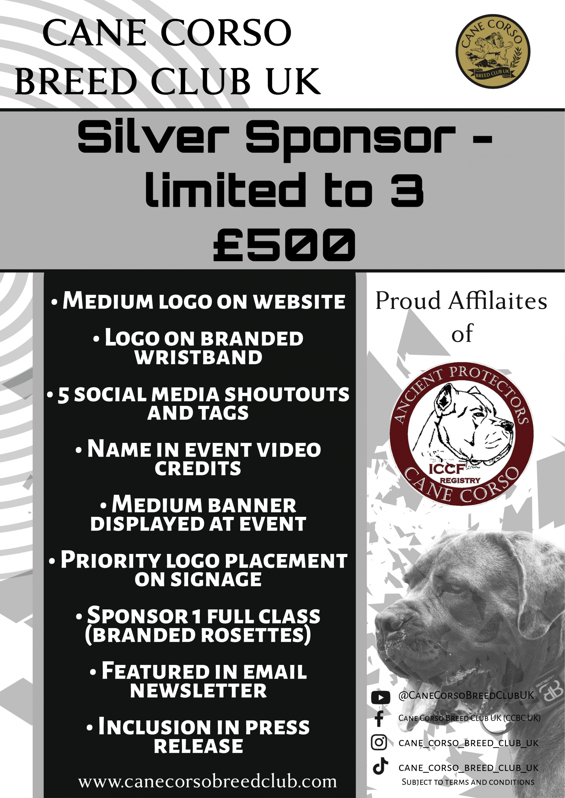 Limited to 4 Your logo on our site, branded wristbands, shoutouts, and rosette sponsorship at the show.SILVER