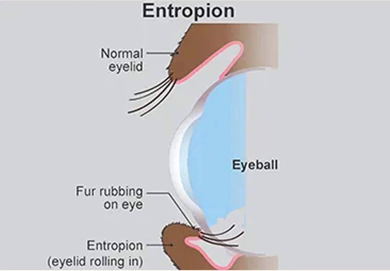 Entropion is a conformational eyelid disorder where the eyelid rolls inward, causing the eyelashes and hair to rub against the surface of the eye. In Cane Corsos, this is usually genetic and structural, and can lead to chronic pain, corneal damage, and vision loss if untreated.