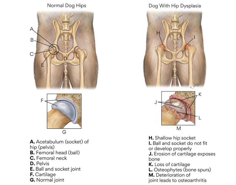 The discomfort associated with hip dysplasia occurs because instead of the head of the femur being seated solidly in the hip socket, there is excess motion – called laxity. Joint laxity causes painful stretching of the joint capsule and wearing of joint cartilage. If you read the lesson on Arthritis, you know that wearing of joint cartilage causes the inflammatory changes that we call arthritis