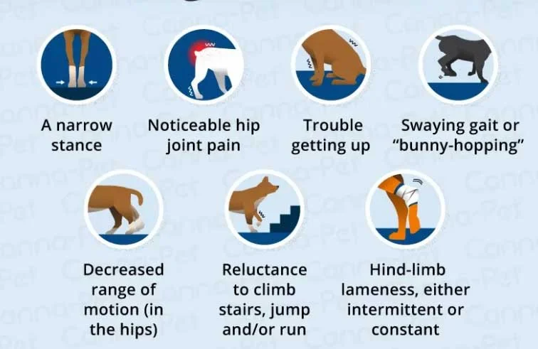 Hip dysplasia is often described as a bi-phasic condition, meaning clinical signs tend to appear at two distinct stages of life. The first phase commonly occurs during puppyhood or adolescence. Signs may include a “bunny-hopping” gait when running, reluctance to jump, stiffness, or difficulty rising from a seated position. Some young dogs appear to improve as they mature, although the underlying joint structure remains abnormal.