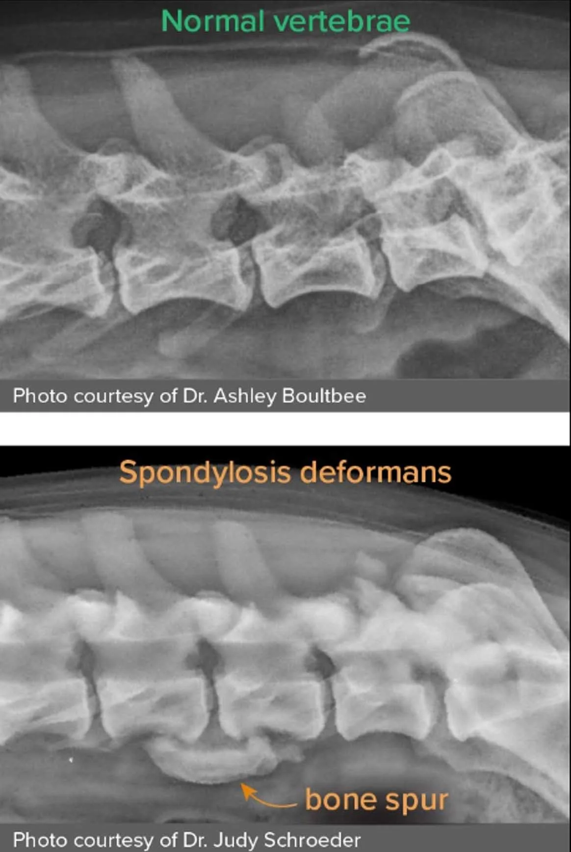 Spondylosis deformans is a degenerative condition of the spine where bony spurs form along the edges of the vertebrae. It is commonly associated with ageing and wear on the spinal joints and is frequently seen in large, heavy-boned breeds such as the Cane Corso.