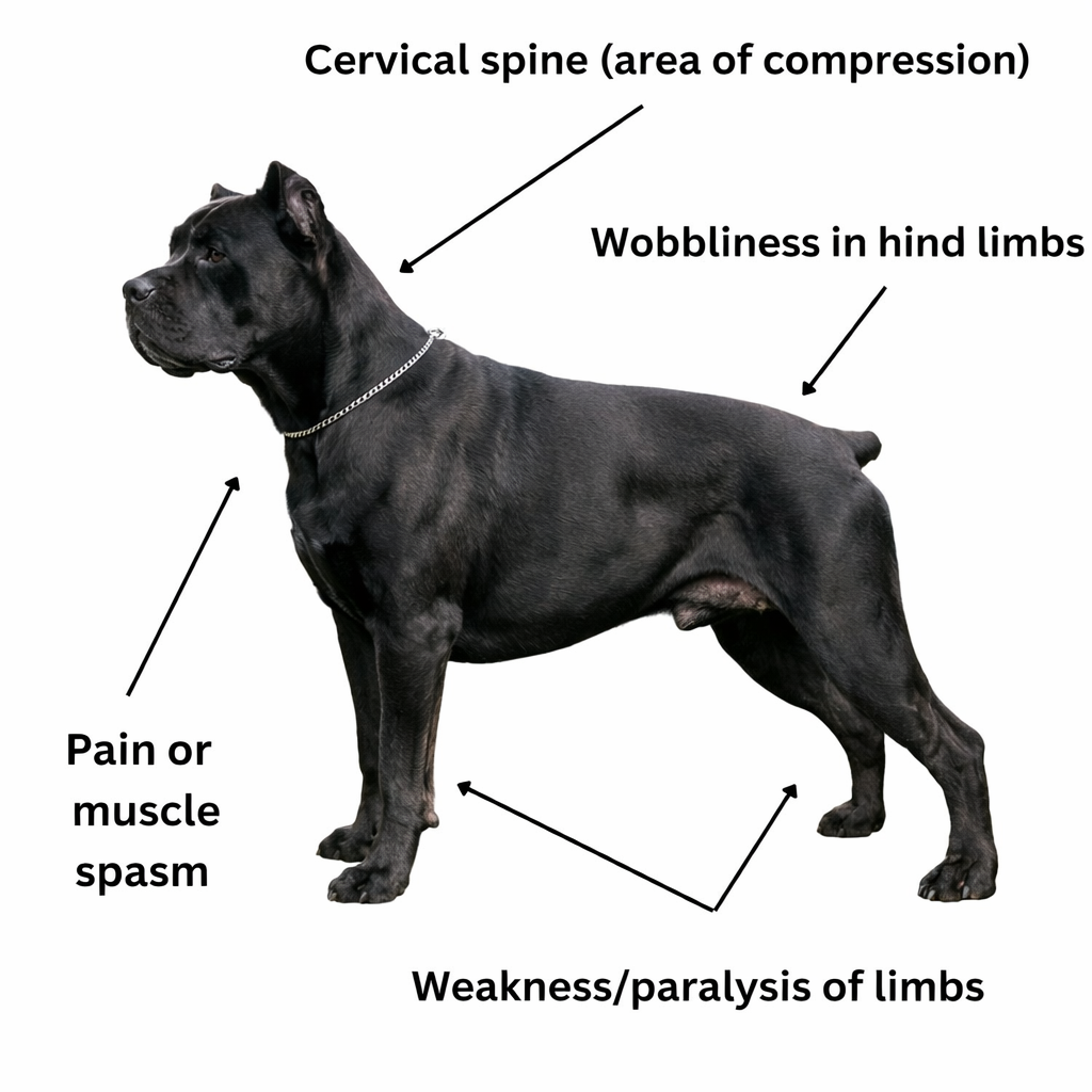 Wobbler syndrome is a neurological condition caused by compression of the spinal cord in the neck (cervical spine). This compression interferes with normal nerve signalling, leading to weakness, poor coordination, and an unsteady gait.